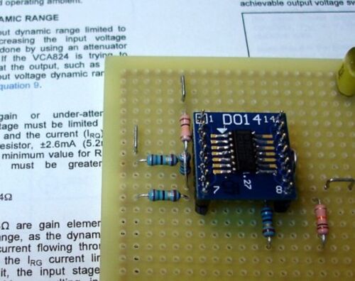 かなりクドイですが、マイクアンプに使うALCアンプについて実験していました。前回はアナログマルチプレクサ(乗算器)ICを使って、ALCへの応用を試みましたが、今回は現代的広帯域VGA(可変利得アンプ)IC、TI製のVCA824が手に入ったので遊んでいます。本IC…